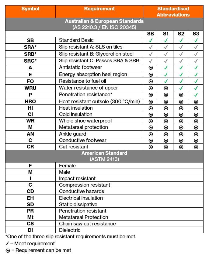 All safety footwear needs to be labelled with the standards that it has been certified to comply with. Due to the number of mandatory and additional standards that footwear can be certified to in the Australian and European standards the most common combinations of additional standards have standardised abbreviations for ease of labelling. Below is an overview of the requirements and their respective certification: