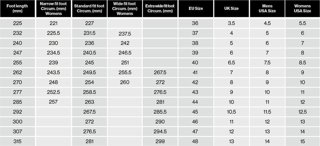 uvex multiple fit system offers multiple widths in the same length in core sizes. Fitting widths are based on the measurement of the widest part of the foot. Measurement is taken of the circumference of the foot at the base joint of the big toe and the joint at the base of the little toe. This will determine the required shoe width in combination with foot length