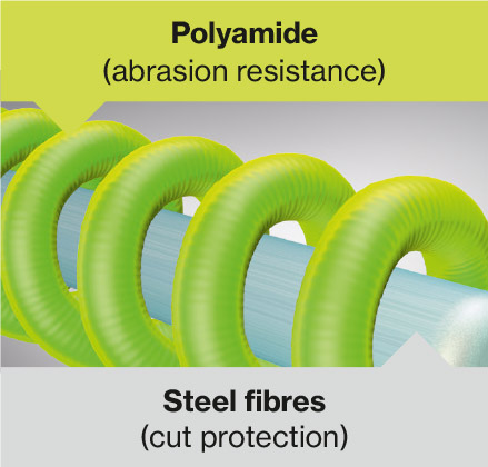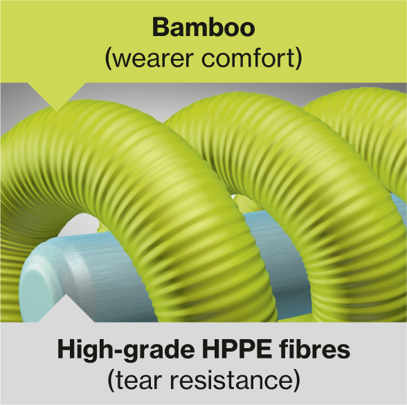 Comfort function: Silky, comfortable bamboo yarn for a soft feel and perfect climate control combined with innovative DSM Dyneema® Diamond fibres provides a further significant boost to tear and cut resistance.